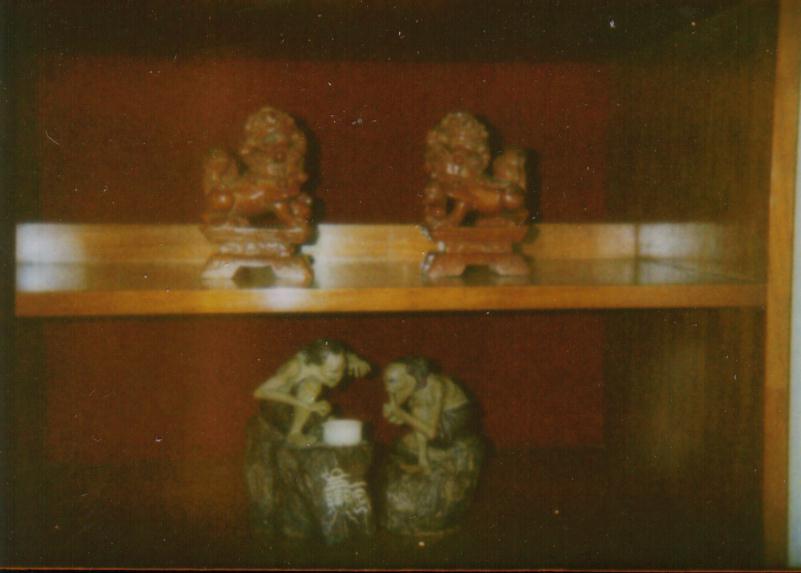 I'm attaching the picture of objects which are facing my main door (frontage area, inside the house). Those on upper level are a pair of wooden lions. If we stand facing them, the female one is on our right. Whereas the male one (holding a ball) is on our left. Do you see any problem with their placement?